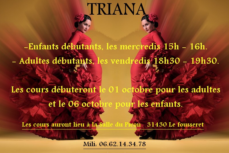 Triana est une association de danses espagnoles, danses sévillanes, flamenco. Nous présentons notre gala de fin d'année chaque fin de saison au Fousseret (31) et animons également fêtes locales, évènements privés, etc. Mili, originaire d'Almensilla (Séville) dispense les cours à l'association et partage ainsi sa culture pour le plus grand plaisir de tous. Contacts : milimiami@gmail.com ou associationtrianaflamenco@orange.fr